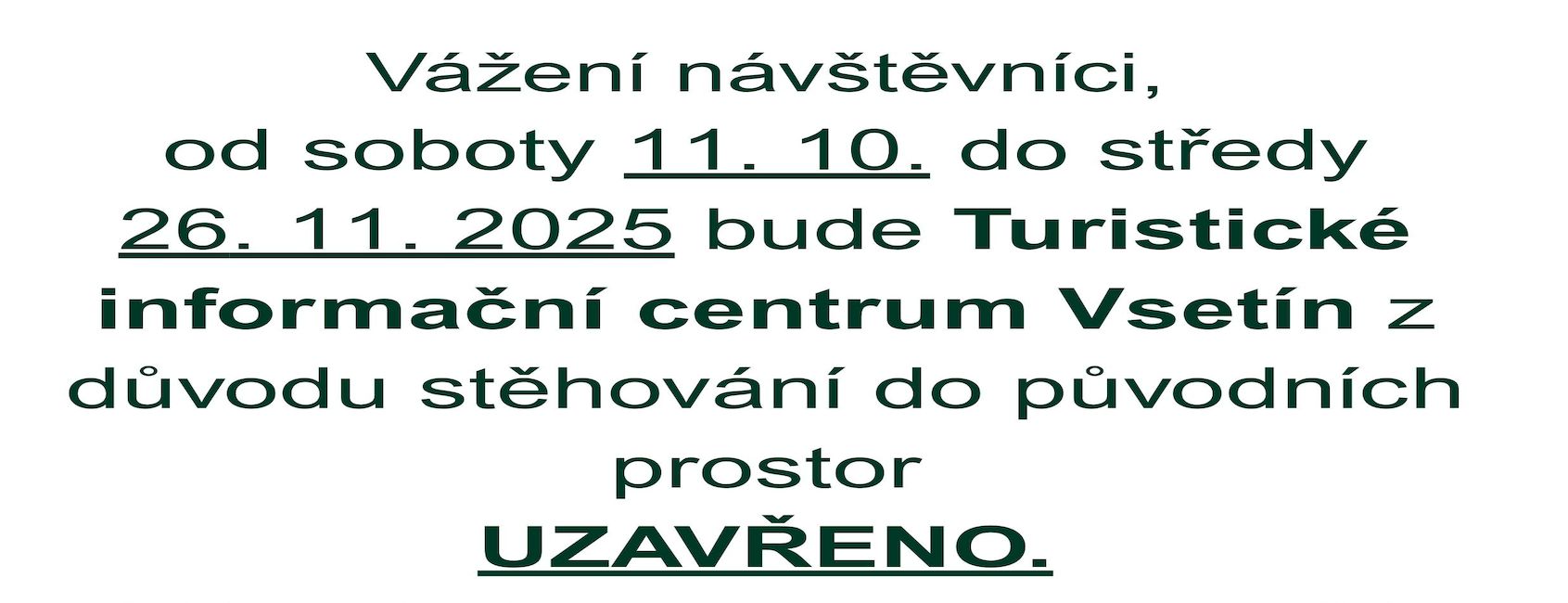 Z důvodu stěhování, nebude možné dočasně od 11.10 - 26.11.2025 v TURISTICKÉM INFORMAČNÍM CENTRU VSETÍN zakoupit vstupenky na divadelní představení do DIVADLA V LIDOVÉM DOMĚ.