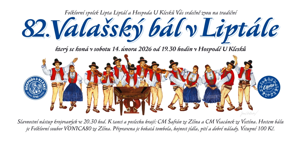 Folklórní spolek Lipta Liptál a hosoda U Klesků Vás srdečně zvou na tradiční Valašský bál.