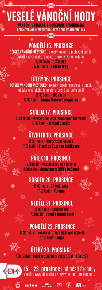 Veselé vánoční hody oživí v prosinci centrum Vsetína hudbou, zábavou i vůní vánočních dobrot. Předvánoční program začne v pondělí 15. prosince na náměstí Svobody a potrvá až do úterý 23. prosince.